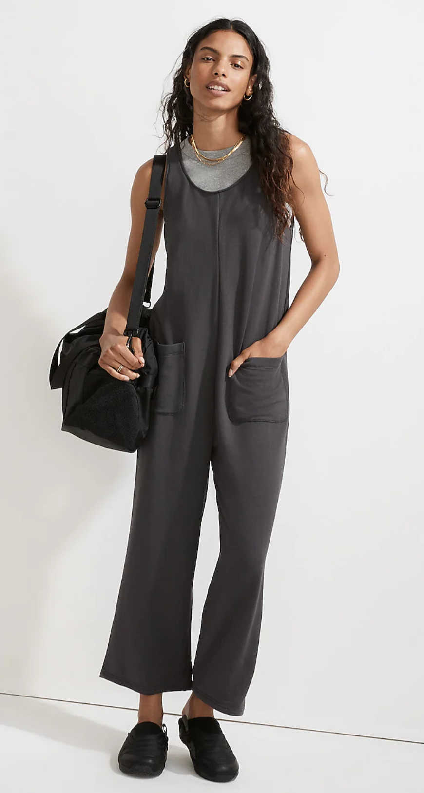 One of my absolute favorite jumpsuits is from Madewell – it's their Super brushed Pull-On Jumpsuit. Not only is it as smooth as butter against your skin, but it also boasts generously sized front pockets, perfect for stashing essentials like credit cards or your phone. I recently put this jumpsuit to the test during a long plane ride, and it turned out to be the best decision I've made in quite a while.